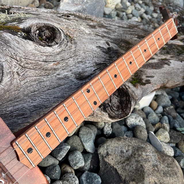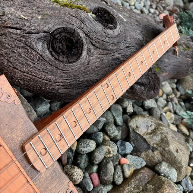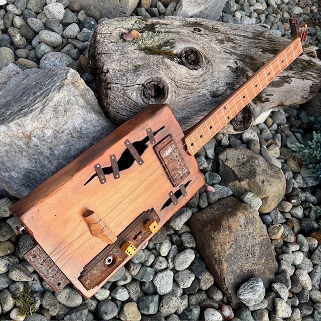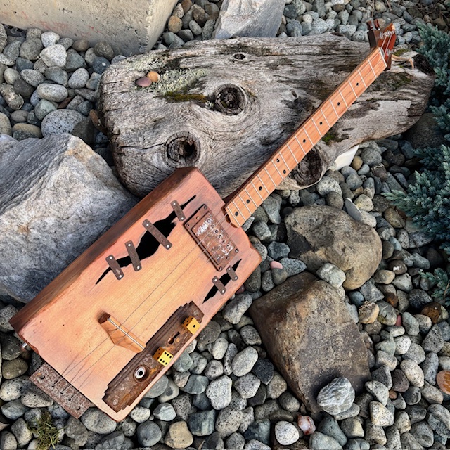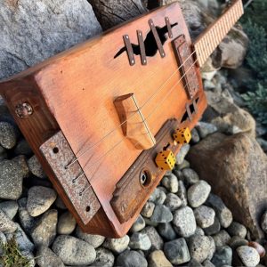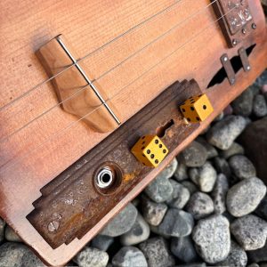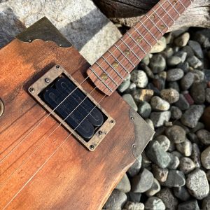 “Gambler” is fully fretted and fully electric. He is set up on a 25-1/2″ scale length and boasts incredible action and intonation. Tuned to an Open G tuning, this guitar has a lot of tone. The neck is made from Red Heart hardwood and has a fretboard made from nicely figured Big Leaf Maple.