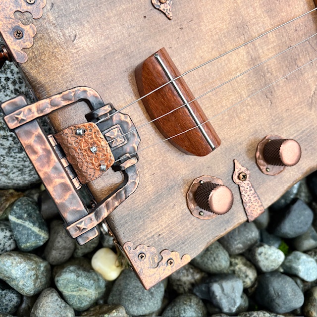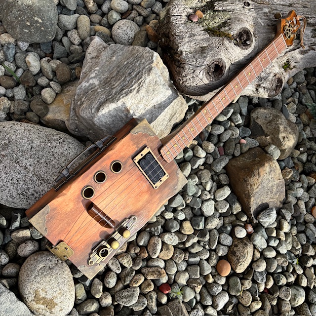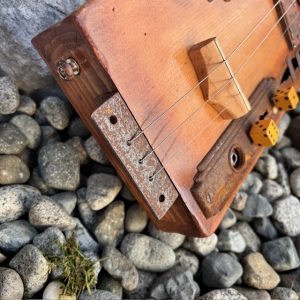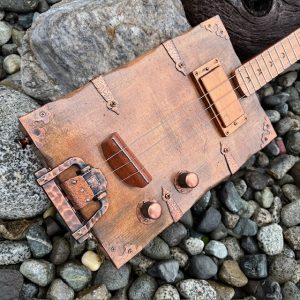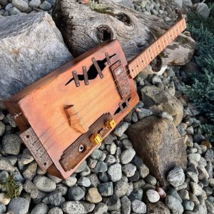 “Broonzy” is a fully fretted and fully electric 3 sting guitar. The tuning is Open G (G-D-G) and he is a dream to play! The scale length is 25-1/2″ with low action and great intonation.
