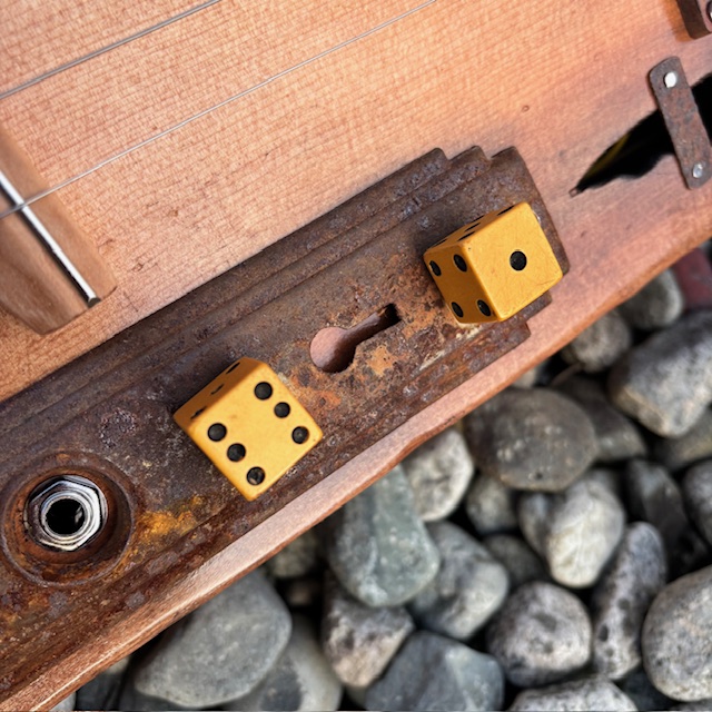 “Gambler” is all about looking vintage. To make sure you know the guitar was made by 61 Nickel Guitars, the dice being used as volume and tone control knobs are figured as a six and a one (of course)!! The hand painted and carefully distressed guitar body was made from Sitka Spruce and BC Pine. The randomly “repaired” sound holes are done with strips of rusted metal and the control plate is fashioned from an old rusty doorknob escutcheon. The string retainer is a rusted piece of angle iron and the pickup has been scratched and painted to look well worn.