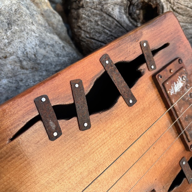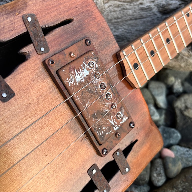 This guitar style is one of my favourite guitars to build! The handmade wooden guitar body made from BC Pine and Sitka Spruce has been distressed and hand painted with special effects to make it appear worn and aged. The “rotted” sound holes with rusty steel patches are very unique and really add to the distressed theme.