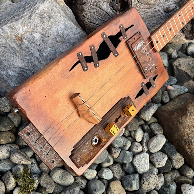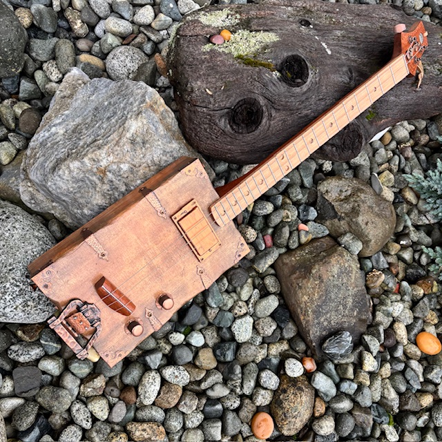 “Aaralyn” is a hand crafted cigar box style guitar constructed of B.C. Spruce sides and Spalted Red Alder top and back. She is finished in a clear Varathane to showcase her beautiful woodgrain. The neck is made from rich, dark Black Walnut with Curly Maple headstock wings. The fretboard is also Curly Maple and contrasts nicely with the dark colour of the Walnut.