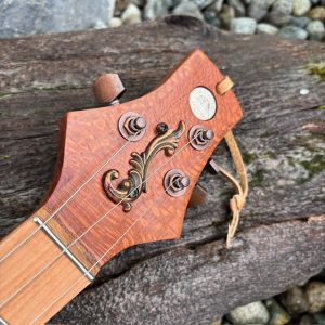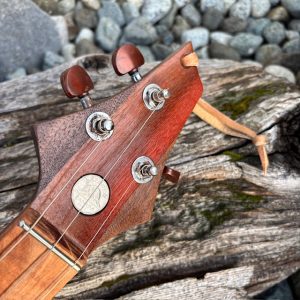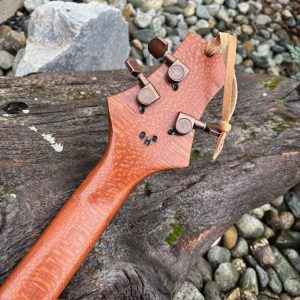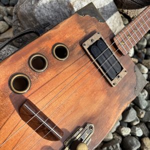 “1964” is fully fretted and fully electric and is tuned to an Open G chord. The single coil pickup has a nice bright tone and the scale length is a comfortable 25-1/2″. The zero fret nut system offers low action and great intonation.