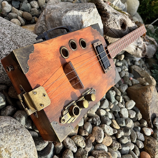 “Broonzy” was created in my “vintage style” of cigar box guitar. My recognizable multi-coat paint effect delivers the aged patina while the distressed edges provide the illusion of a well used instrument. The neck is made from beautiful Green Heart hardwood and features Black Walnut on the headstock wings, the fretboard, and the bridge.