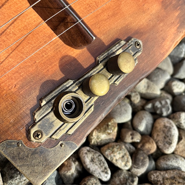Antiqued brass accents are used throughout the design and add that aged look to the the guitar. The old door escutcheon plate used for the control panel and the ornate decoration on the headstock really add a really unique touch.