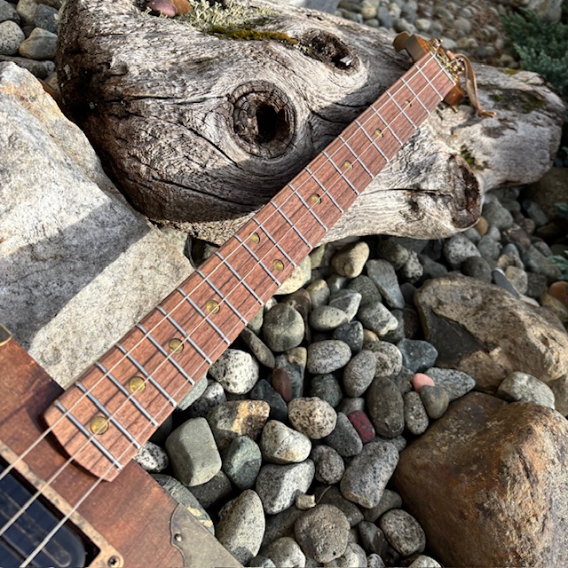 “Rust Never Sleeps” is a fully fretted, fully electric 3 string guitar. It has a 25-1/2″ scale length and features a humbucker style pickup with a very warm tone. The action is low and the intonation is perfect. This thing is deadly!!