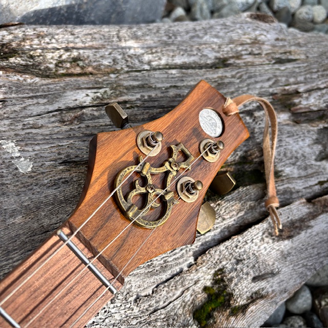 Set up on a 25-1/2″ scale length and tuned to an Open G chord, “Reaper” sounds awesome through the humbucker pickup (that sort of looks like a mouth). The zero fret nut system ensures low action, great intonation, and easy playability.