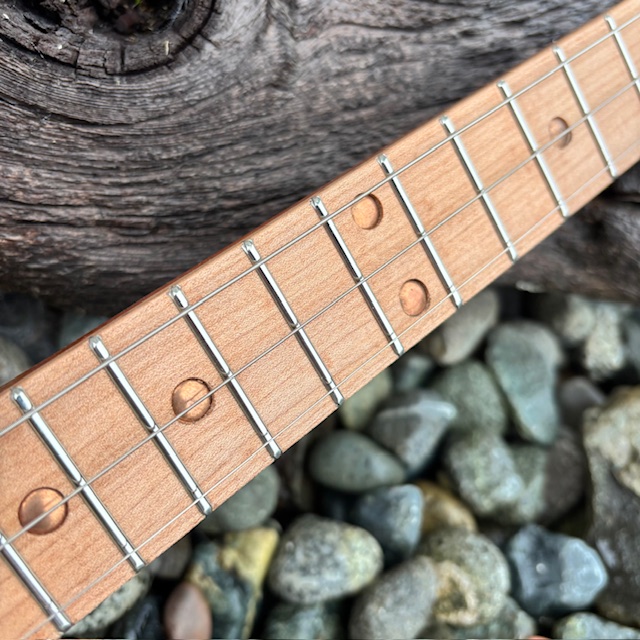 The hand carved neck is made from Big Leaf Maple and the headstock wings and bridge are Black Walnut. The fretboard is also Big Leaf Maple and has a nice lined grain pattern running from the 1st to the 22nd fret.